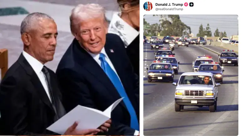 अमेरिकी राष्ट्रपति डोनाल्ड ट्रंप ने एक बार फिर पूर्व राष्ट्रपति बराक ओबामा पर निशाना साधा है और इस बार उन्होंने दुनिया की सबसे चर्चित ‘पुलिस चेजिंग’ मोमेंट का सहारा लिया है. शनिवार को ट्रंप ने अपनी सोशल मीडिया साइट ट्रूथ पर एक एडिटेड तस्वीर साझा की, जिसमें वो मशहूर OJ सिम्पसन व्हाइट फोर्ड ब्रोंको कार चेज की नकल करते नजर आए. तस्वीर में ओबामा को एक भगोड़े की तरह सफेद ब्रोंको चलाते दिखाया गया है, जबकि ट्रंप एक पुलिस वैन में उनका पीछा करते नजर आ रहे हैं.