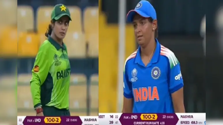 Harmanpreet Kaur vs Nashra Sandhu : महिला वर्ल्ड कप में भारत ने पाकिस्तान को 88 रन से हरा दिया .इस मैच में जहां भारतीय महिला खिलाड़ियों ने नो हैंडशेक नीति को बरकरार रखा तो वहीं, मैदान के दौरान भारतीय महिला खिलाड़ी और पाकिस्तानी खिलाड़ियों के बीच तनाव भी देखने को मिला, जिसका एक वीडियो सोशल मीडिया पर वायरल है. दरअसल, भारतीय पारी के दौरान कप्तान हरमनप्रीत कौर और पाक गेंदबाज नशरा संधू एक दूसरे को आंखें दिखाती हुईं नजर आई. हुआ ये कि भारतीय पारी के 22वें ओवर में नशरा संधू ने ओवर की आखिरी गेंद फेंकने के बाद हरमनप्रीत को गुस्से में घूरने लगी. जिसे देखकर हरमनप्रीत कौर भड़क गई और इसका जवाब देते हुए भारतीय कप्तान ने भी आंख दिखाते हुए अपशब्द कहकर करार जवाब दिया. सोशल मीडिया पर यह वीडियो खूब वायरल हो रहा है.